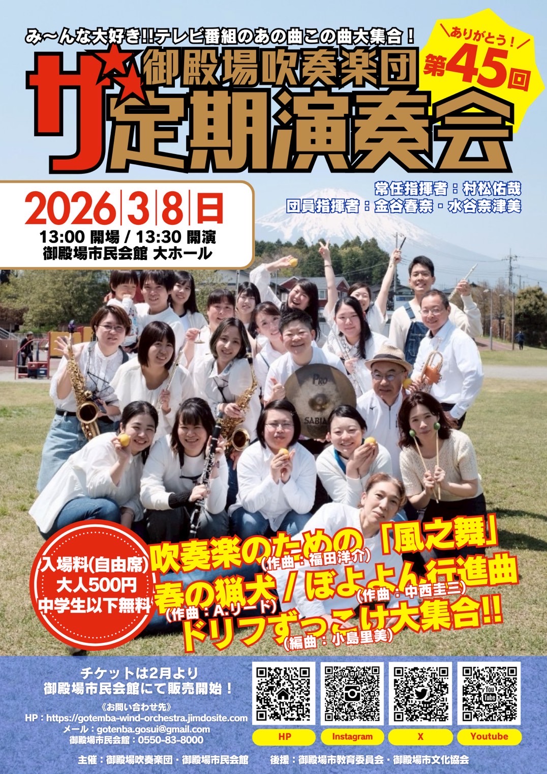 投稿日: 2026年2月1日2026年2月17日第45回 御殿場吹奏楽団 定期演奏会 開催のお知らせ 【日 時】2026年3月8日(日) 開場13:00 開演13:30 【会 場】御殿場市民会館 大ホール 【入場料】全席自由席・税込 大人:500円/中学生以下:無料 【演奏曲目】 吹奏楽のための「風之舞」、春の猟犬、ぼよよん行進曲、ドリフずっこけ大集合!! 【チケット発売日】 2026年2月1日(日)から 御殿場市民会館にて好評販売中! 【問合せ】 御殿場市民会館 TEL 0550-83-8000(9:00~21:00) 静岡県御殿場市萩原183-1